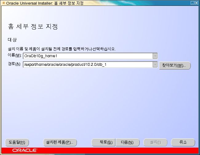 oracle@wl ~ $ cksum 10202_database_solx86.zip 1350902623 681090961 10202_database_solx86.zip oracle@wl ~ $ unzip 10202_database_solx86.zip oracle@wl ~ $ cd database oracle@wl ~/database $ ./runInstaller Oracle Universal Installer 시작 중... 설치 프로그램 요구 사항 확인 중... 운영 체제 버전 확인 중: 필수 버전5.10. 실제 5.10 성공함 임시 공간 확인 중: 250MB 이상이어야 합니다.. 실제 1020MB 성공함 스왑 공간 확인 중: 500MB 이상이어야 합니다.. 실제 1339MB 성공함 모니터 확인 중: 최소 256 색상을 표시하도록 구성되어 있어야 합니다.. 실제 16777216 성공함 설치 프로그램 요구 사항을 모두 충족했습니다. 다음에서 Oracle Universal Installer의 시작을 준비하는 중 /tmp/OraInstall2008-06-19_04-40-02PM. 기다리십시오. oracle@wl ~/database $runInstaller를 실행하면 잠시후 아래와 같은 GUI화면이 뜰 것이다. 자바로 되어있어 썩 모양이 좋지는 않지만 그럭저럭 봐줄만 한다.